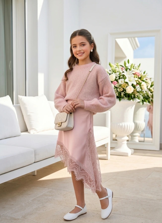 Púdrová saténová sukňa s čipkou